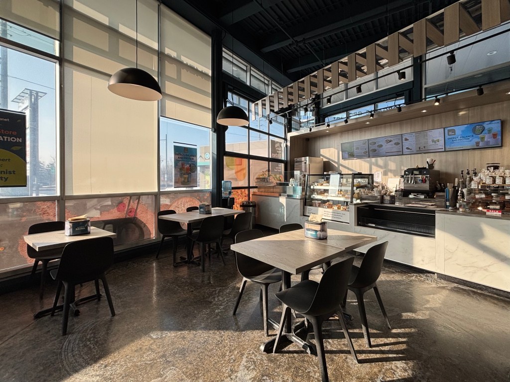 The location includes a small seating area with a counter where you can order food, drinks, and baked goods. It’s not expansive – just several seating spots, but it serves the purpose of offering quick bites or beverages if you need a break during shopping or want something immediately after your workout next door.
